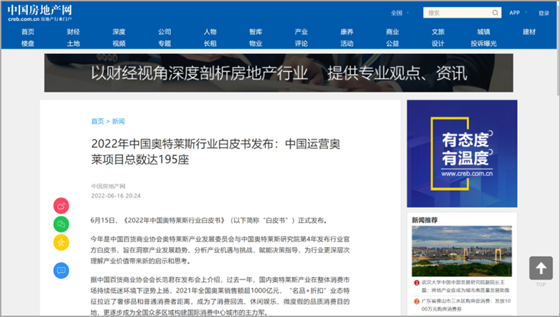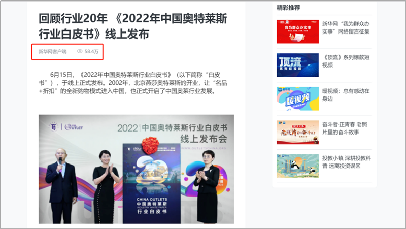 會(huì)后,國內(nèi)主流權(quán)威媒體紛紛在第一時(shí)間通過各自官方平臺(tái)及渠道發(fā)布此次活動(dòng)盛況及內(nèi)容。截止6月23日,共計(jì)近百家媒體在全網(wǎng)發(fā)布、轉(zhuǎn)載“2022年中國奧特萊斯行業(yè)白皮書線上發(fā)布”相關(guān)報(bào)道及新聞百余次,全網(wǎng)累積點(diǎn)擊閱讀量近五百萬次。