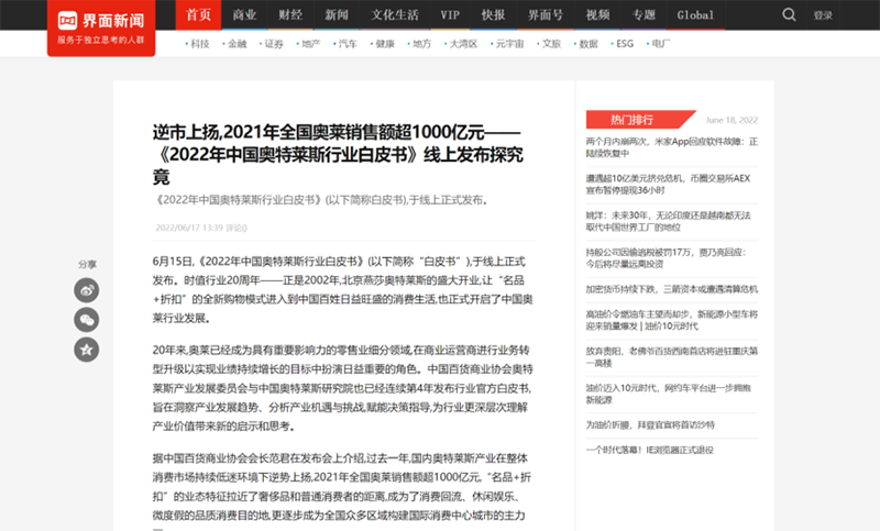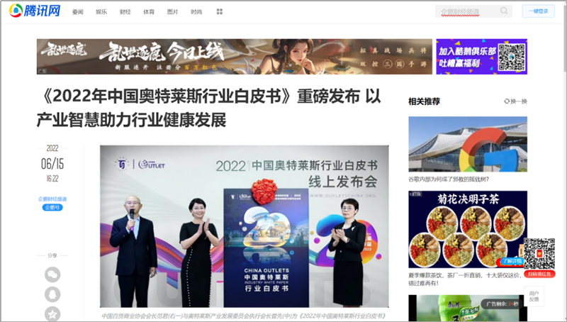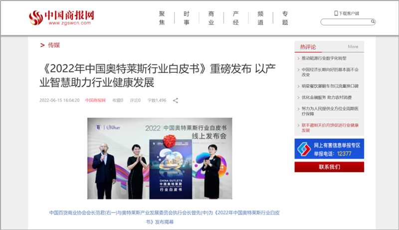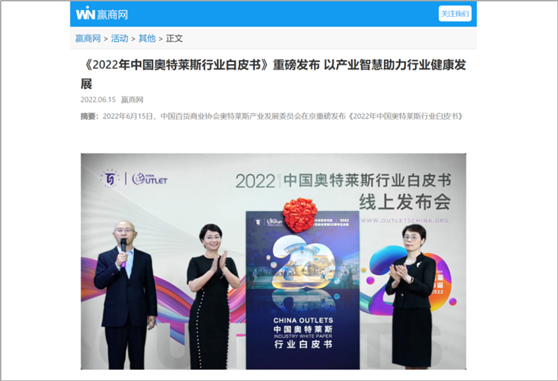 2022年6月15日,中國百貨商業(yè)協(xié)會(huì)奧特萊斯產(chǎn)業(yè)發(fā)展委員會(huì)線上直播發(fā)布《2022年中國奧特萊斯行業(yè)白皮書》。白皮書中“2021年中國零售市場最新發(fā)展、中國奧萊20年全覽、2021年中國奧萊市場發(fā)展、中國奧萊展望和政策建議、專家訪談”等內(nèi)容吸引政府領(lǐng)導(dǎo)、專業(yè)機(jī)構(gòu)、產(chǎn)業(yè)運(yùn)營商、品牌商、服務(wù)商、媒體記者及眾多奧萊消費(fèi)者共計(jì)20余萬人參會(huì),成為國內(nèi)奧萊行業(yè)年度一大焦點(diǎn)。