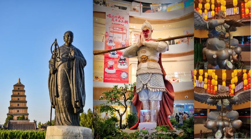 以西安大悅城為例,他深挖大唐、長安歷史文化底蘊,與在地城市地標形成呼應(yīng),中庭悟空與大雁塔玄奘雕像隔街對望,并打造契合潮流時尚客群訴求的“勿空”美食街區(qū)與“不戒食巷”,街區(qū)內(nèi)的墻體上還有師徒四人取經(jīng)歸來的立體壁畫,讓原本只以美陳形式存在的孫悟空、豬八戒變成文化傳播的紐帶。