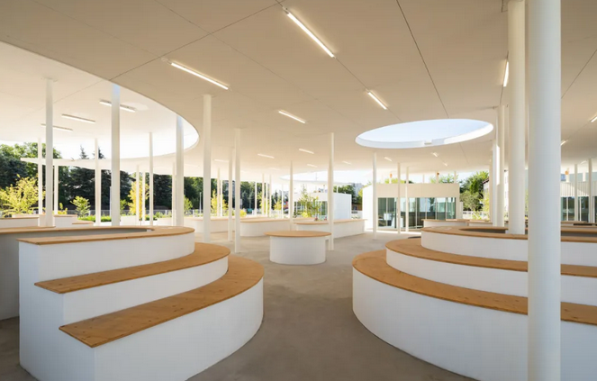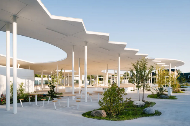 此外,廣場(chǎng)光滑的混凝土面層沒(méi)有路緣石,無(wú)論是步行、坐輪椅還是滑滑板都可以在市場(chǎng)上安全自由地移動(dòng),方便了不同人群的使用,體現(xiàn)了設(shè)計(jì)的人性化和包容性;各種街道固定裝置如白色的圓形信息板、自行車架、巨石、鳥(niǎo)類和昆蟲(chóng)屋及社區(qū)共用桌椅等點(diǎn)綴其中。在極具特色的有機(jī)屋頂下,還設(shè)有帶木雕動(dòng)物造型搖椅的游樂(lè)花園,為集市增添了藝術(shù)氛圍和趣味性。